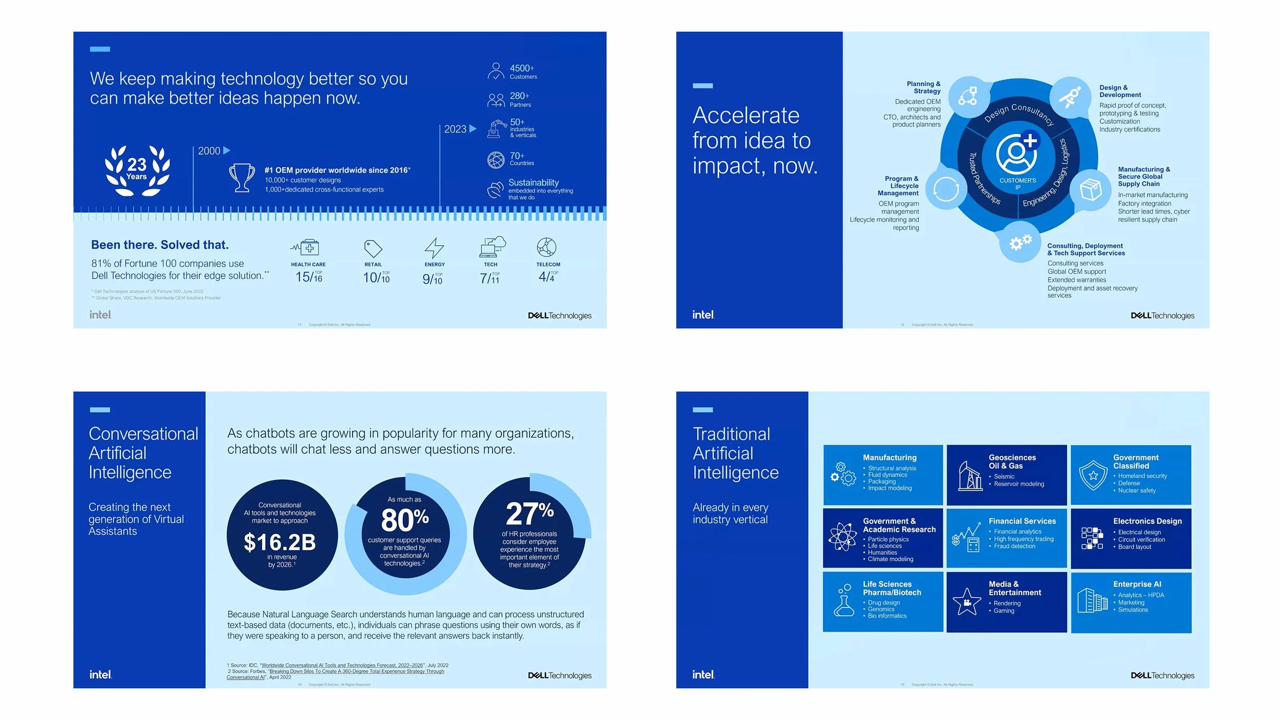 Throughout my career at Dell, I designed for a variety of executive presentations, sales webinars, event keynotes and creative pitch decks. Most of this work was internal and confidential, but below you will find some examples of my presentation design for B2C clients.